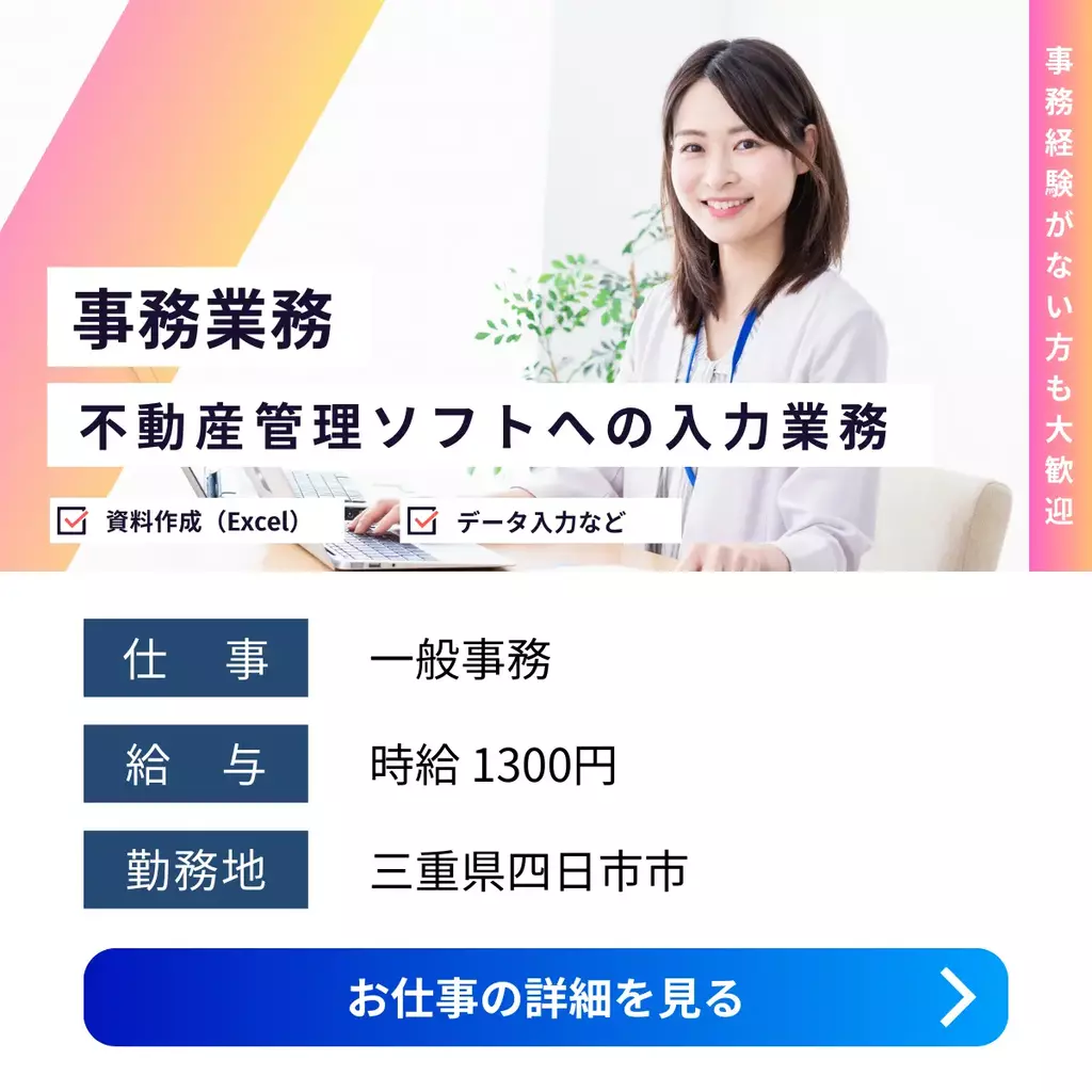 【三重県四日市市】事務求人|電話対応なし・9:30~勤務で働きやすい|未経験OK・女性活躍中三重県1300円以上1200円以上正社員登用制度求人事務四日市市未経験者歓迎経験不問経験者歓迎シフト制家族手当交通費支給有給休暇昼勤(日勤)資格不要社会保険主婦・主夫歓迎女性活躍中派遣四日市オフィス2025-12-01 01:07