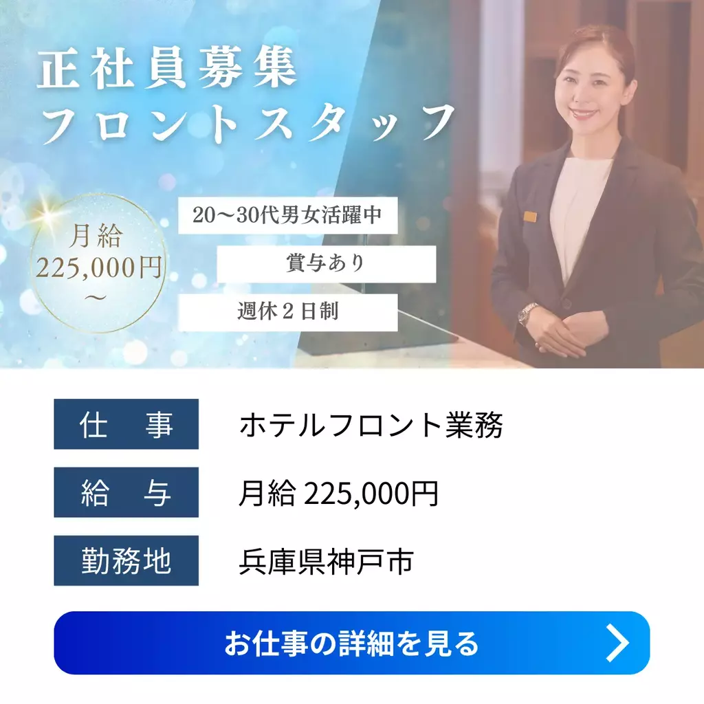 【兵庫県神戸市】人気デザインホテルでフロント募集|月給22万円〜|未経験歓迎兵庫県接客正社員登用制度求人未経験者歓迎経験不問ブランクOKシフト制家族手当交通費支給有給休暇社会保険女性活躍中男性活躍中派遣賞与加古川オフィス神戸市2025-12-01 05:29
