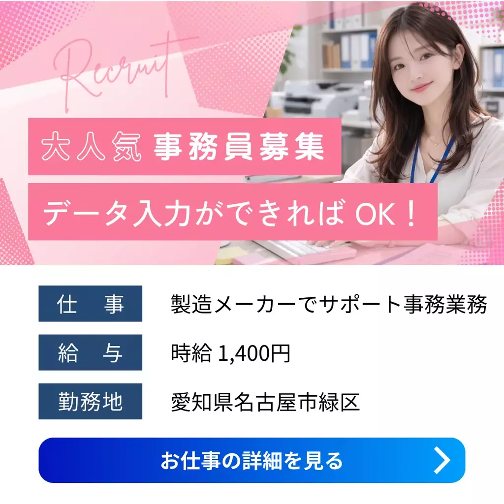 【愛知県名古屋市緑区】土日休み×残業なし|メーカー事務スタッフ募集1400円以上1300円以上1200円以上求人事務名古屋市経験者歓迎転勤なし土日休み昼勤(日勤)軽作業残業なし・少なめ主婦・主夫歓迎女性活躍中派遣名古屋オフィス2026-02-26 02:04