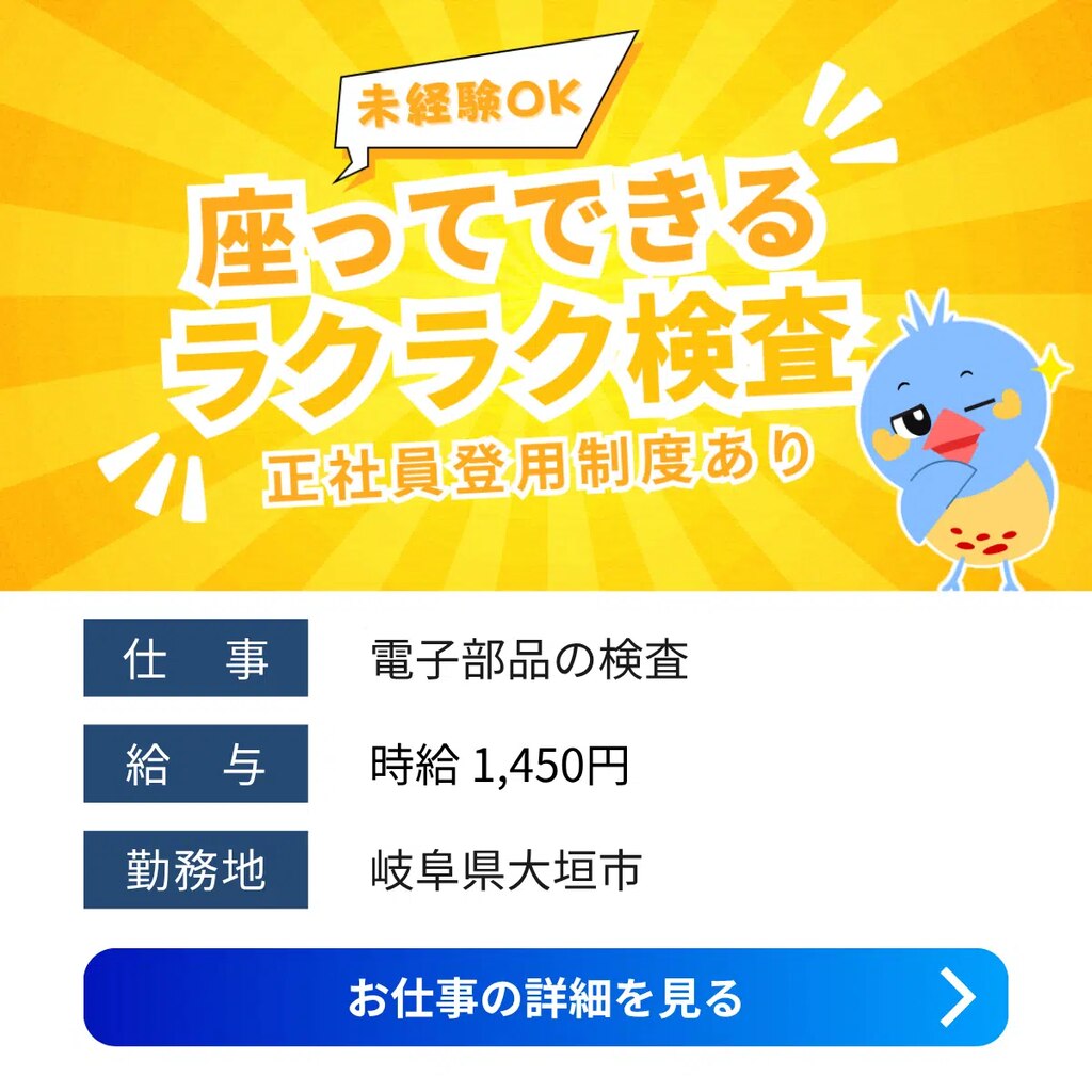 【岐阜県大垣市木戸町】高時給1,450~|岐阜県内でトップクラスの半導体メーカー内でのオシゴト!岐阜県1400円以上1300円以上1200円以上正社員登用制度検査工場求人未経験者歓迎経験者歓迎家族手当転勤なし交通費支給社員食堂あり社会保険女性活躍中寮付き家電付き寮1R派遣住み込み春日井オフィス大垣市待機寮2025-04-08 05:05