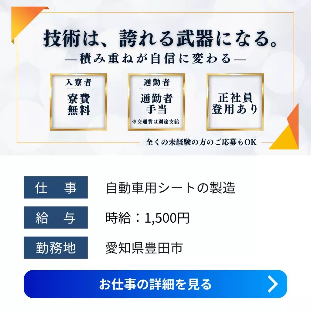【愛知県豊田市】高時給1,500円~|自動車の座席シートの各種製造組立加工愛知県運搬1500円以上1400円以上1300円以上1200円以上正社員登用制度機械オペレーター検査高時給工場求人未経験者歓迎経験不問経験者歓迎家族手当転勤なし交通費支給有給休暇土日休み資格不要女性活躍中男性活躍中寮付き家電付き寮1R派遣高収入三河オフィス豊田市待機寮2025-04-17 06:19