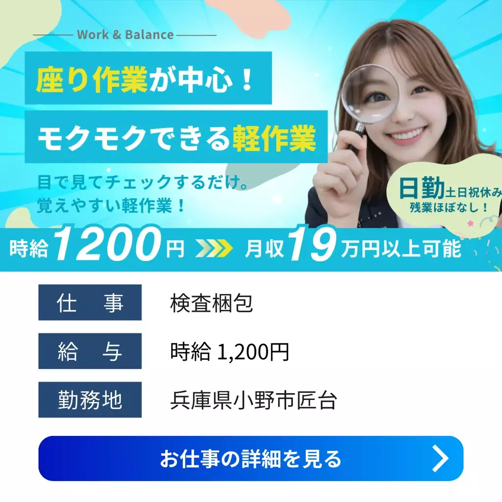【兵庫県小野市】時給 1,200円 ~月収19万円以上可能|プラスチック製品の検査|未経験者歓迎!兵庫県1200円以上検査製造工場求人シニア活躍中未経験者歓迎中高年経験不問経験者歓迎家族手当転勤なし土日休み昼勤(日勤)工場内作業社会保険小野市加古川オフィス2025-04-03 01:56