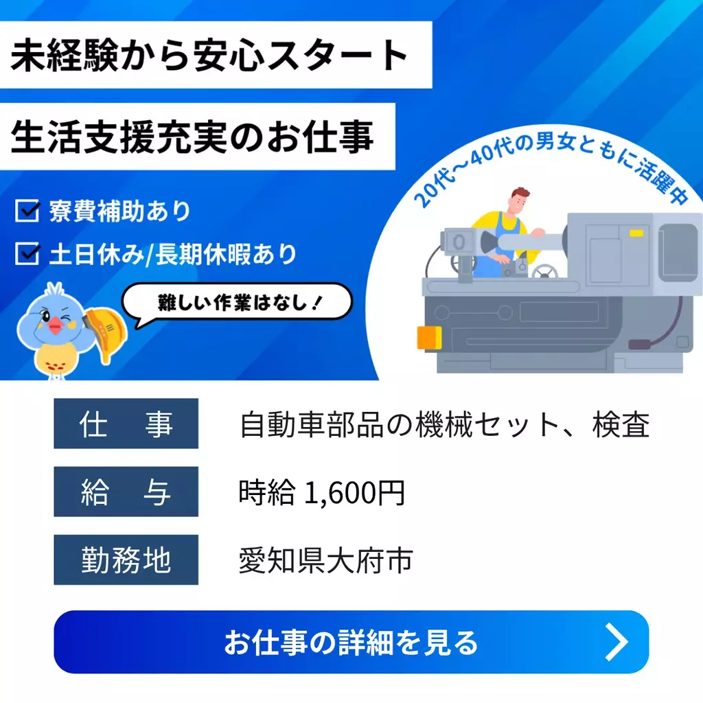 【愛知県大府市】高時給1,600円〜|自動車部品製造|未経験OK組立愛知県1600円以上1500円以上1400円以上1300円以上1200円以上機械オペレーター検査製造工場求人未経験者歓迎経験不問経験者歓迎ブランクOK家族手当交通費支給土日休み社員食堂あり資格不要社会保険主婦・主夫歓迎女性活躍中男性活躍中寮付き家電付き寮1R派遣住み込み三河オフィス大府市待機寮2025-02-27 02:01