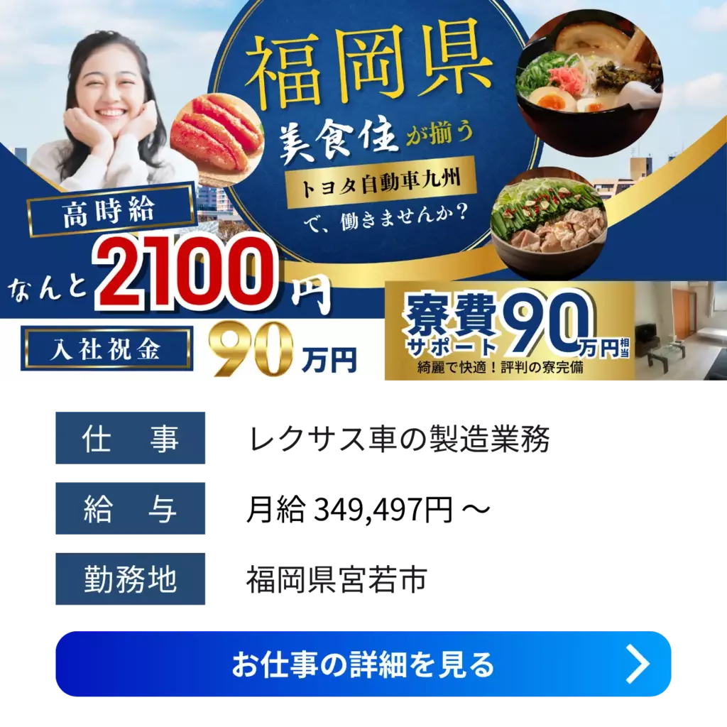 【福岡県宮若市】時給2,100円+入社祝金90万円|寮費無料&福岡移住