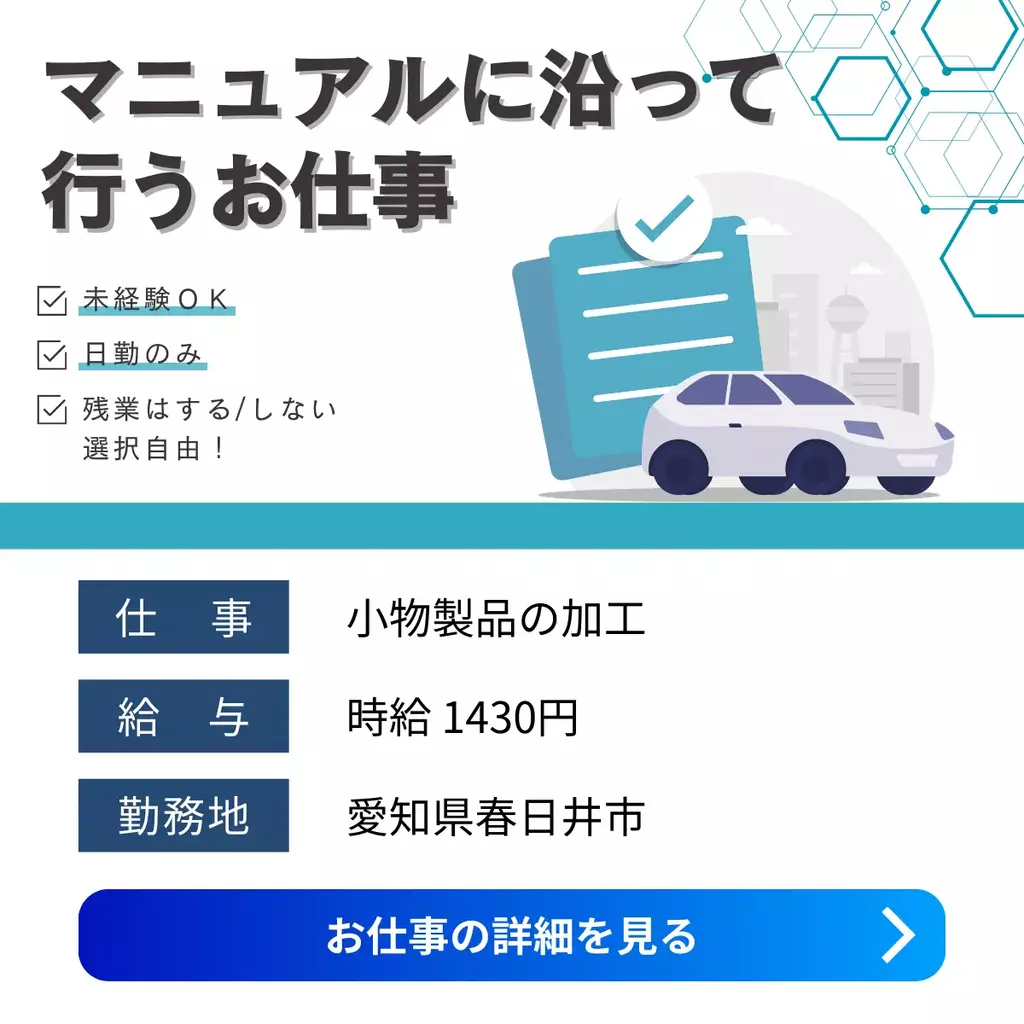 【愛知県春日井市】残業は選択自由|日勤のみ・土日祝休み|小物製品の加工加工愛知県1400円以上1300円以上1200円以上正社員登用制度製造工場求人未経験者歓迎経験不問経験者歓迎家族手当交通費支給昼勤(日勤)工場内作業社員食堂あり資格不要土日祝休み社会保険主婦・主夫歓迎女性活躍中男性活躍中派遣春日井オフィス春日井市2025-11-28 05:43