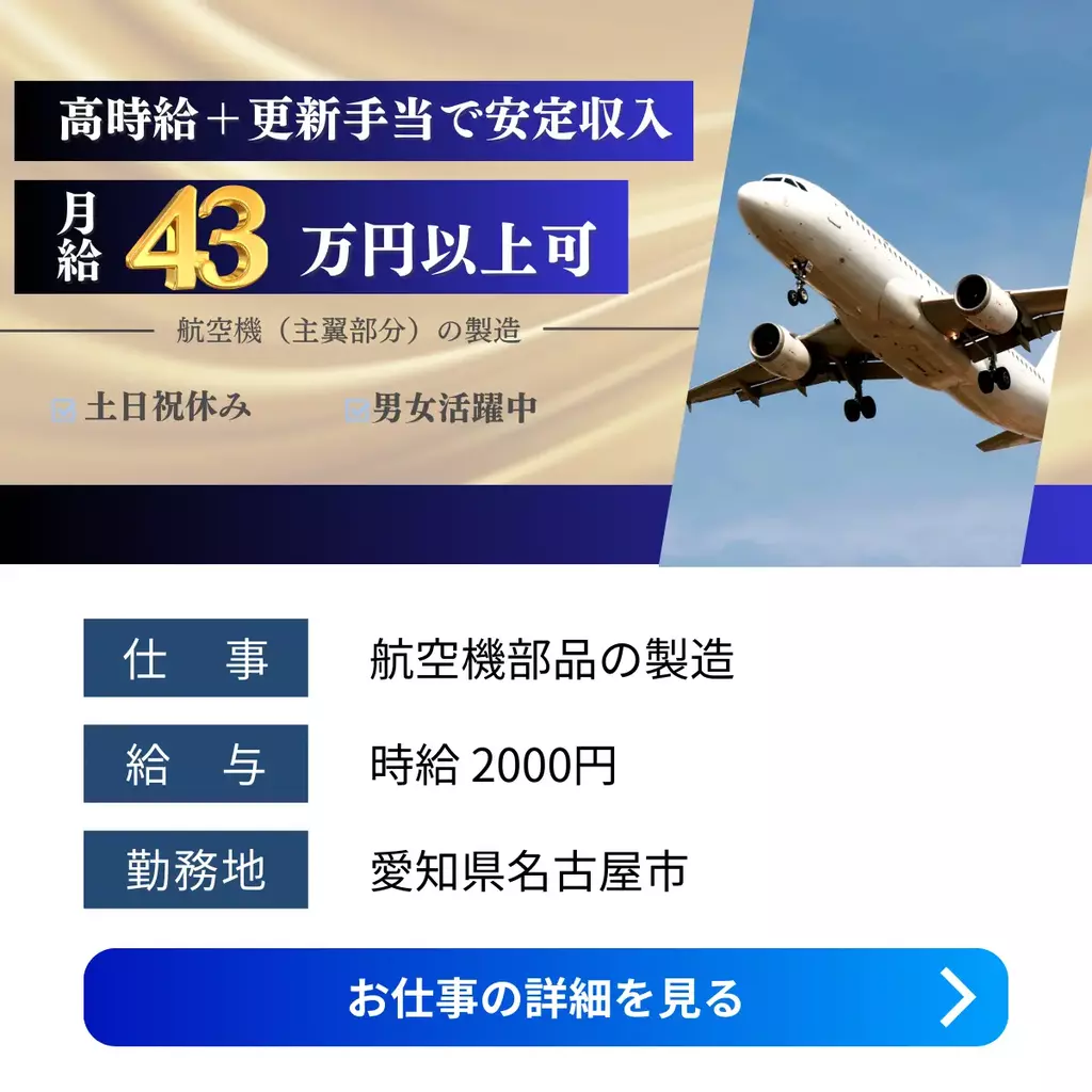 【愛知県名古屋市】航空機製造スタッフ|未経験OK・時給2000円〜・更新手当3万円加工愛知県1600円以上1500円以上1400円以上1300円以上1200円以上手当有1800円以上1700円以上高時給製造工場1900円以上求人名古屋市未経験者歓迎経験不問ブランクOK家族手当交通費支給工場内作業社員食堂あり資格不要土日祝休み社会保険女性活躍中男性活躍中寮付き家電付き寮1R派遣高収入住み込み名古屋オフィス2025-11-28 07:37