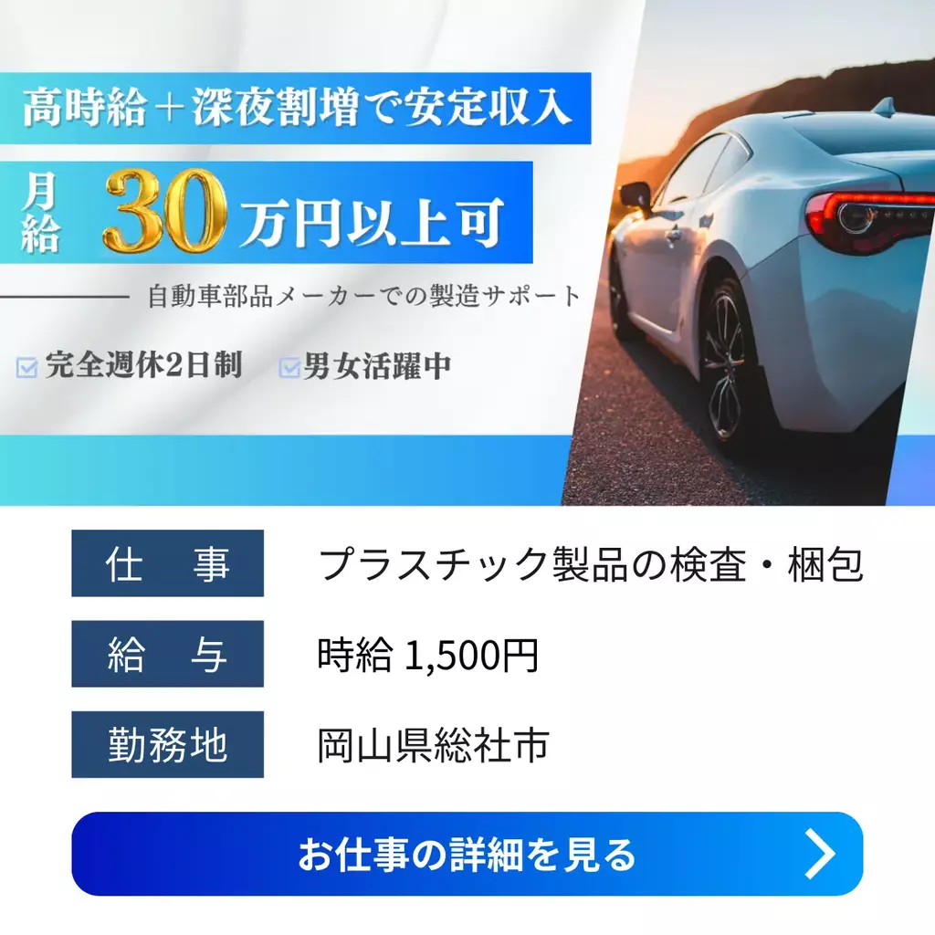 【岡山県総社市】未経験活躍中|高時給1500円|完全週休2日制岡山県1500円以上1400円以上1300円以上1200円以上検査高時給製造工場求人未経験者歓迎経験不問経験者歓迎ブランクOK家族手当交通費支給有給休暇土日休み軽作業工場内作業資格不要社会保険男性活躍中派遣高収入岡山オフィス総社市梱包2025-09-09 00:32