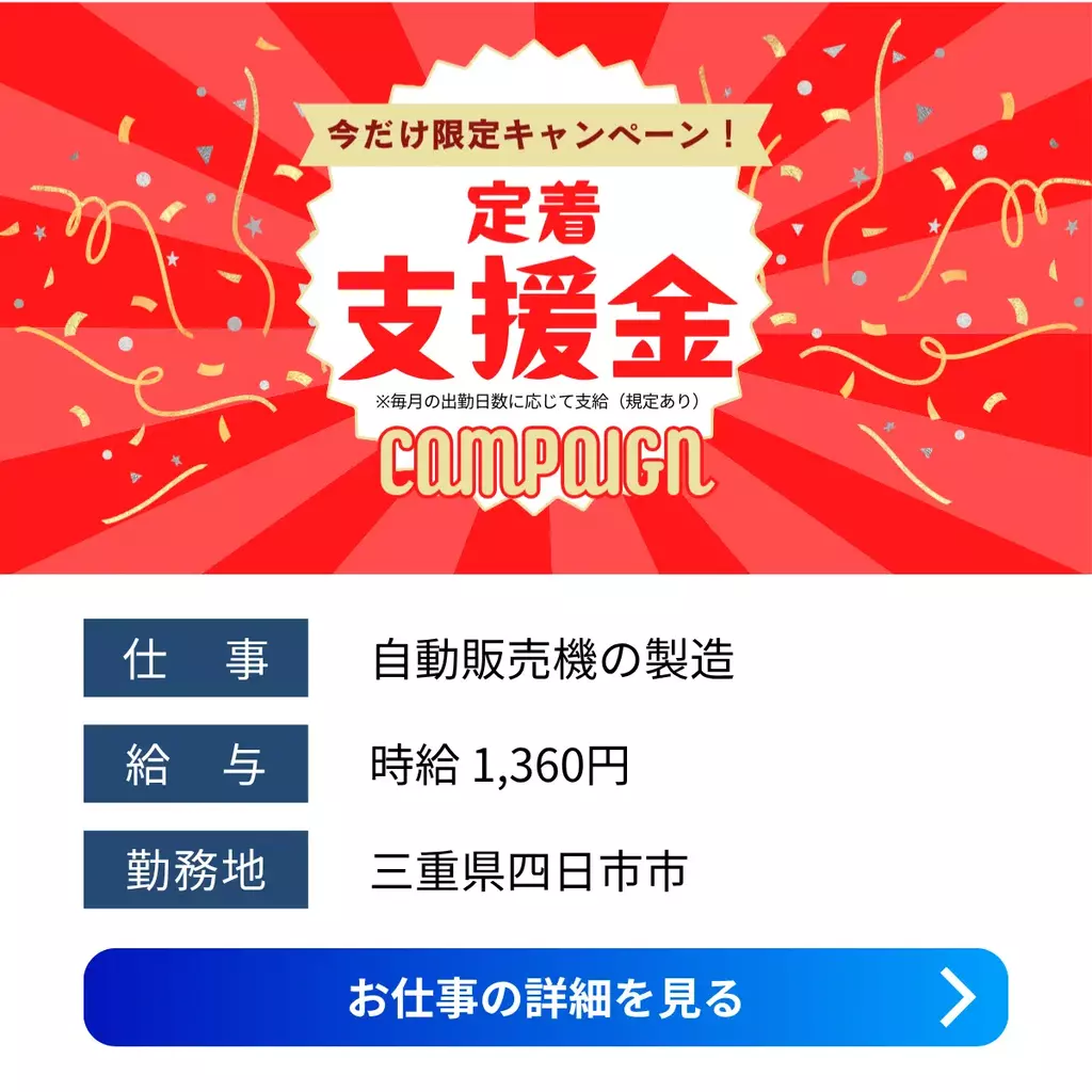 【三重県四日市市】自販機製造スタッフ募集|家電付き寮完備×未経験OK×土日祝休み組立加工三重県運搬1300円以上1200円以上手当有製造工場求人四日市市未経験者歓迎家族手当転勤なし交通費支給工場内作業資格不要土日祝休み社会保険寮付き家電付き寮1R派遣四日市オフィス梱包待機寮2025-12-25 01:00