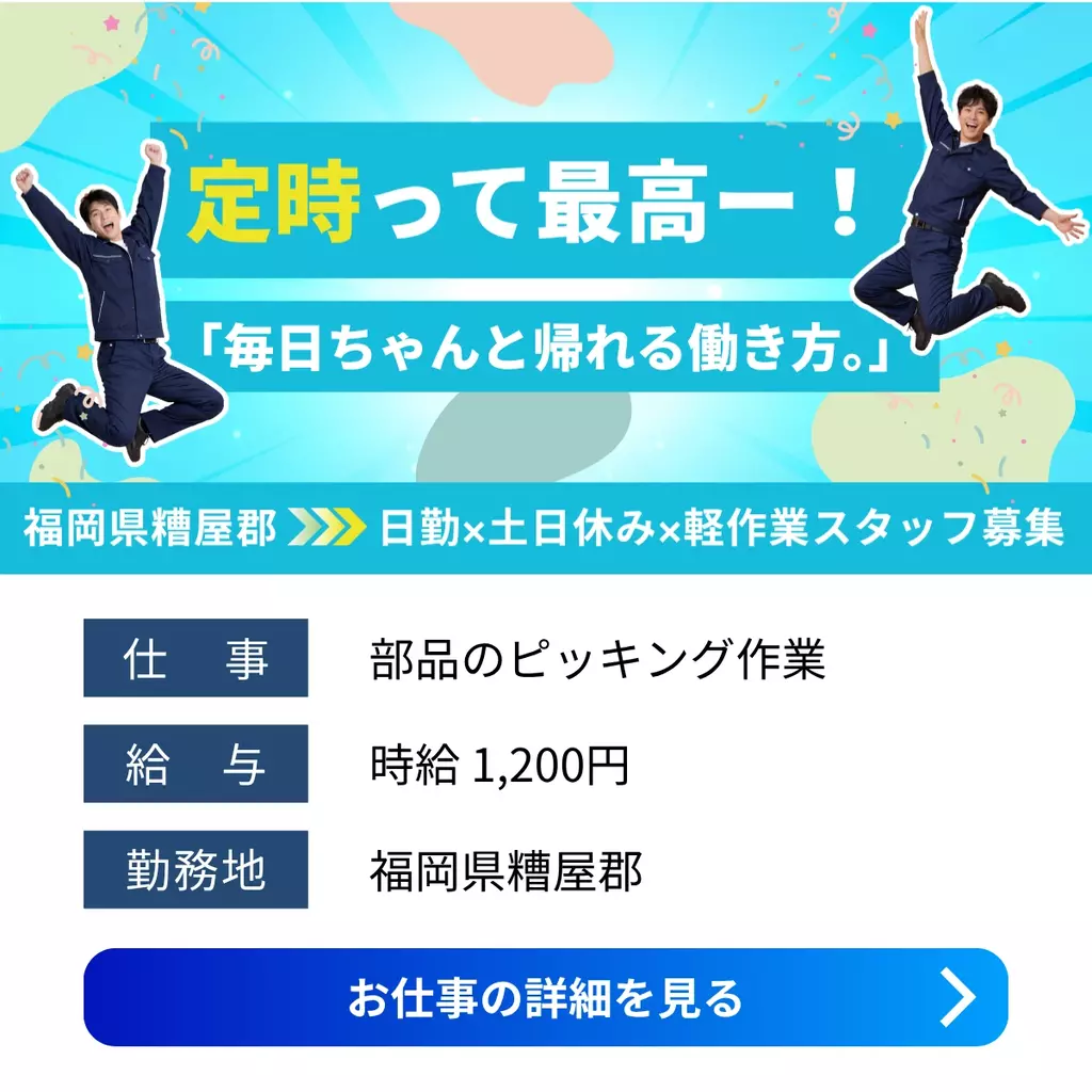 【福岡県糟屋郡】時給1,200円+月収20万円+日勤のみ|軽作業ピッキング運搬1200円以上福岡県工場求人未経験者歓迎経験不問家族手当転勤なし土日休み昼勤(日勤)軽作業工場内作業社会保険男性活躍中派遣北九州オフィスピッキング糟屋郡2026-04-14 07:20