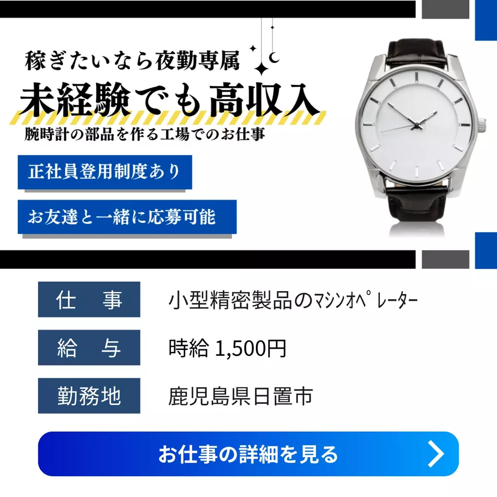 【鹿児島県日置市】時給1500円|夜勤専従のマシンオペレーター求人|正社員登用あり1500円以上1400円以上1300円以上1200円以上機械オペレーター検査高時給製造工場求人未経験者歓迎経験不問経験者歓迎ブランクOK家族手当転勤なし交通費支給有給休暇夜勤資格不要土日祝休み社会保険派遣高収入鹿児島県鹿児島オフィス日置市2025-02-27 02:36