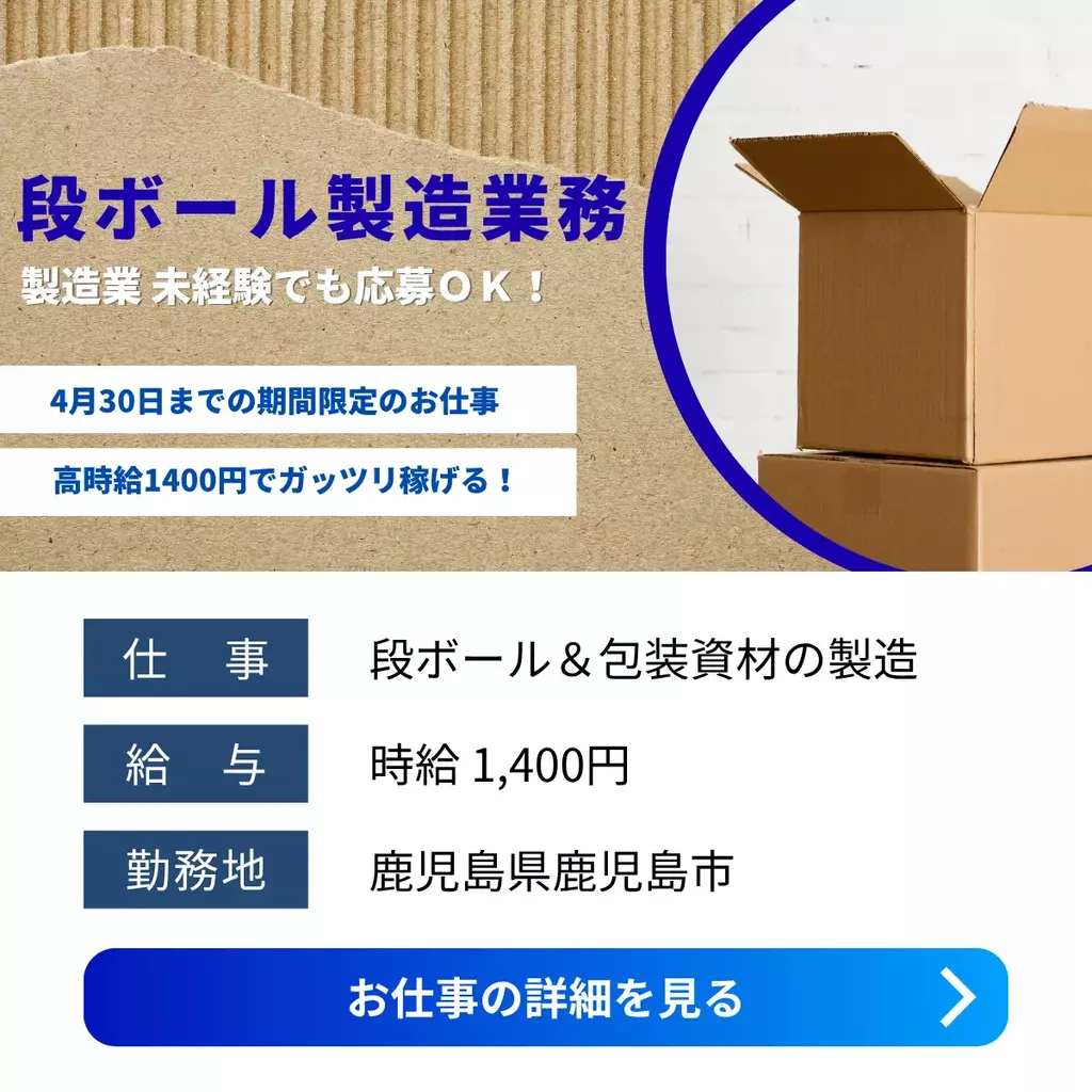【鹿児島県鹿児島市】ダンボール製造スタッフ|高時給1,400円~&未経験OK1400円以上1300円以上1200円以上検査高時給製造工場求人未経験者歓迎経験不問家族手当転勤なし交通費支給昼勤(日勤)工場内作業資格不要社会保険派遣高収入鹿児島県鹿児島オフィス梱包2025-10-14 00:57