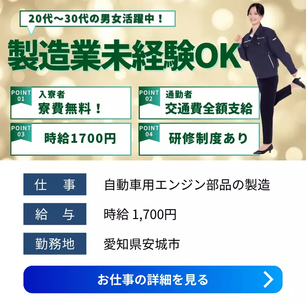 【愛知県安城市】自動車部品の組立・加工・検査スタッフ|高時給&寮完備|未経験歓迎組立加工愛知県寮費無料1600円以上1500円以上1400円以上1300円以上1200円以上1700円以上検査製造工場求人未経験者歓迎経験不問ブランクOK家族手当交通費支給有給休暇土日休み工場内作業社員食堂あり資格不要社会保険女性活躍中男性活躍中寮付き家電付き寮1R派遣住み込み三河オフィス安城市待機寮2025-12-11 01:44